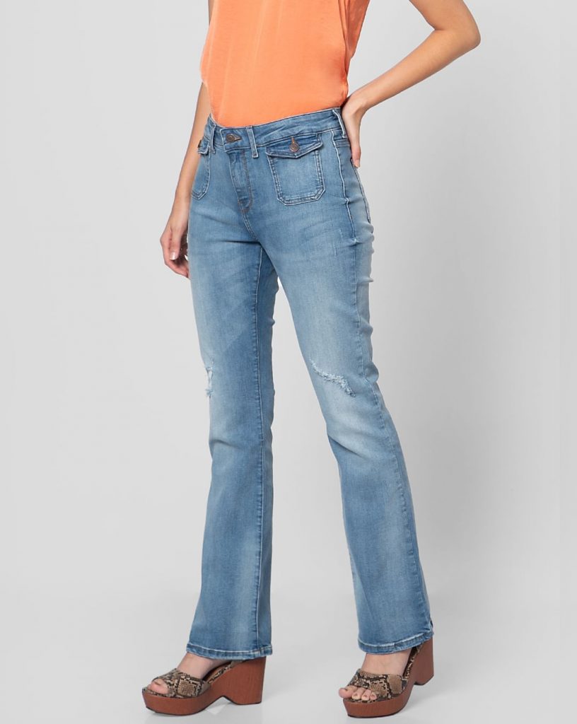 Flared jeans are definitely the way to go. A flared pair of jeans offers a wide opening on the bottom and a tight fit on the thighs, making them the ideal everyday pants.